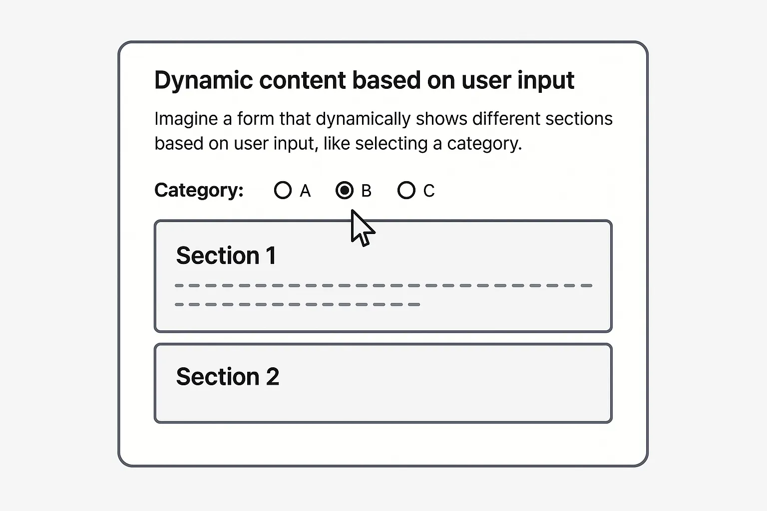 Imagine a form that dynamically shows different sections based on user input, like selecting a plan, a feature or an option in a config view…